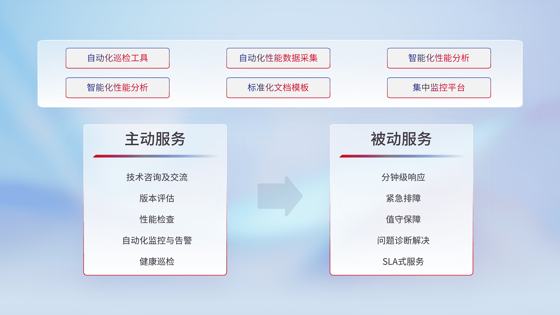 智能化工具和标准化文档,,,,保障服务质量,,,,提供主动服务(包含技术咨询、、、、版本评估、、性能检查、、、、自动化监控与告警、、健康巡检)和被动服务包含(分钟级响应、、、、紧急排障、、值守保障、、、问题诊断解决、、SLA服务)。。。。